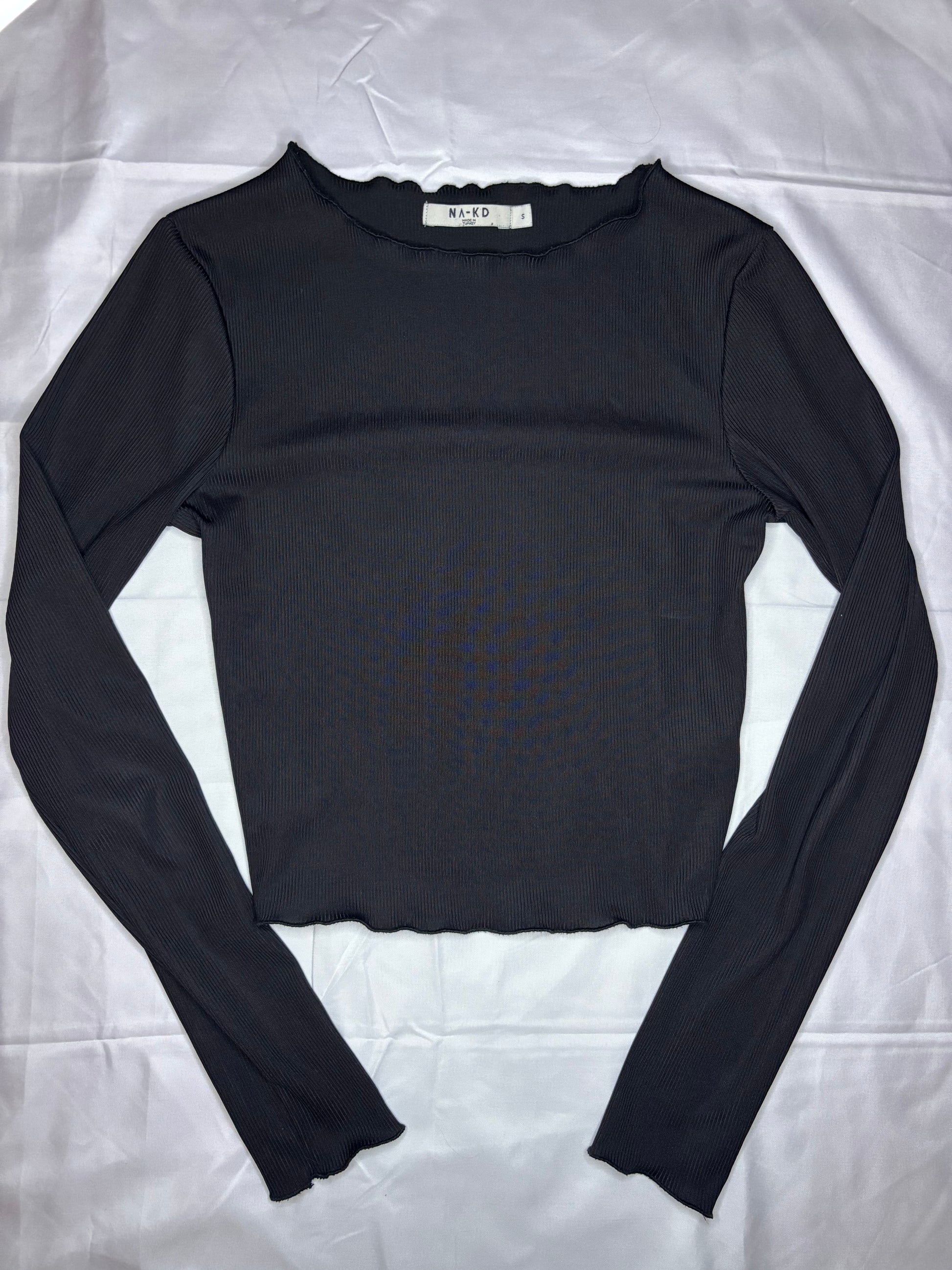 Type: Black ruffle-edge ribbed long sleeve crop top